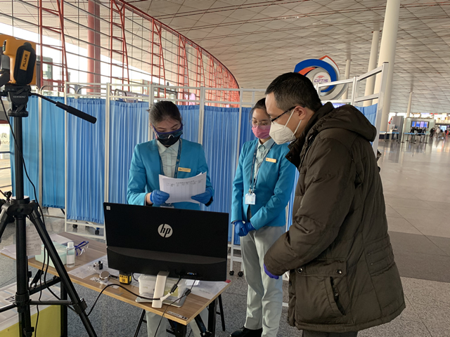 早上八點多,杜生慧開始了當天的疫情防控監(jiān)督工作。他心里惦記著前天有旅客在微博上反映的進港測溫區(qū)人流聚集問題,便先來到T1行李廳??吹叫录友b的測溫門、地上醒目的間隔地標和整齊的蛇形拉帶,他輕舒了一口氣,想到這會兒不是旅客進港高峰,決定下午再來查看。按照計劃,他今天要監(jiān)督檢查T1、T2航站樓的旅客疫情防控措施和員工疫情防控落實情況。航站樓是旅客進出港的必經(jīng)之處,疫情防控任務十分艱巨。對疫情防控負有監(jiān)督職責的杜生慧,同樣任重道遠。