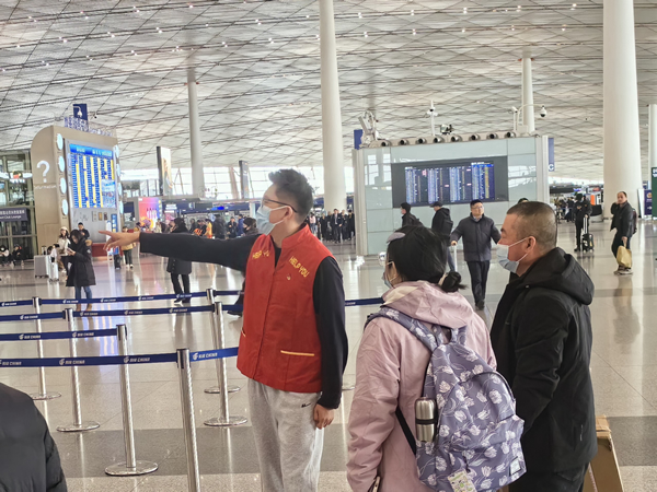 春運(yùn)以來,首都機(jī)場(chǎng)“人氣”持續(xù)攀升,現(xiàn)場(chǎng)保障壓力也逐漸凸顯。航站樓管理部青年們從小事做起、從細(xì)處著眼,致力為旅客提供更好的全流程出行體驗(yàn)。團(tuán)員青年們分別在旅客集中的四層值機(jī)區(qū)和二層到達(dá)區(qū)為有疑惑的旅客提供進(jìn)出港流程、相應(yīng)值機(jī)柜臺(tái)、登機(jī)口位置、安檢禁限帶物品、三超行李、交通出行指引等信息的提示;重點(diǎn)關(guān)注兒童、老年人和輪椅旅客等特殊旅客群體,提供熱情貼心的服務(wù)。此外,大家還結(jié)合自身業(yè)務(wù),積極投入到行李后廳、電扶梯、值機(jī)柜臺(tái)、消防設(shè)備等各個(gè)現(xiàn)場(chǎng)或各類設(shè)施設(shè)備的檢查工作中,全力保障行李運(yùn)輸順暢無損、現(xiàn)場(chǎng)設(shè)備安全可靠,讓旅客出行舒適溫馨。