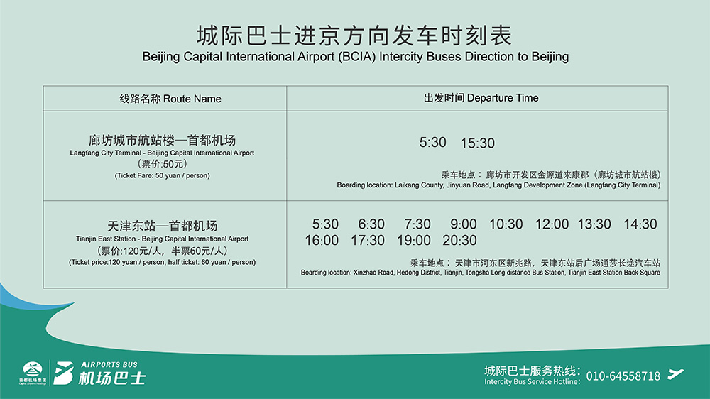票價(jià):50元(注:持有首都機(jī)場進(jìn)出港航班機(jī)票乘客可免費(fèi)乘坐廊坊城市航站樓機(jī)場巴士。廊坊城市航站樓前往首都機(jī)場的需持有本人3日內(nèi)有效機(jī)票;首都機(jī)場前往廊坊城市航站樓的需持有本人24小時(shí)內(nèi)機(jī)票。)