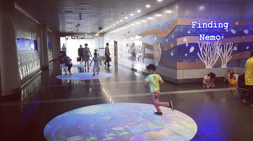 T2連廊口設(shè)置了集“水族觀賞、合影留念、投影互動(dòng)”于一體的T2“海底世界”景觀走廊,新加入的投影互動(dòng)系統(tǒng),將T2“海底世界”的動(dòng)態(tài)影像投影于地面,在紅外系統(tǒng)的監(jiān)控下,旅客腳步踩過(guò)“水面”,游魚(yú)會(huì)“匆匆”游走,不經(jīng)意間的高科技互動(dòng)體驗(yàn),為旅客帶來(lái)了意外的歡樂(lè)。